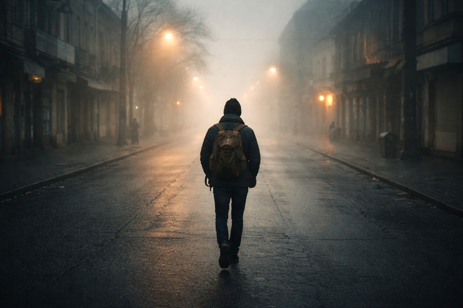 AI street photography of a lone traveler walking through an empty street, foggy morning, emotional mood, cinematic photography