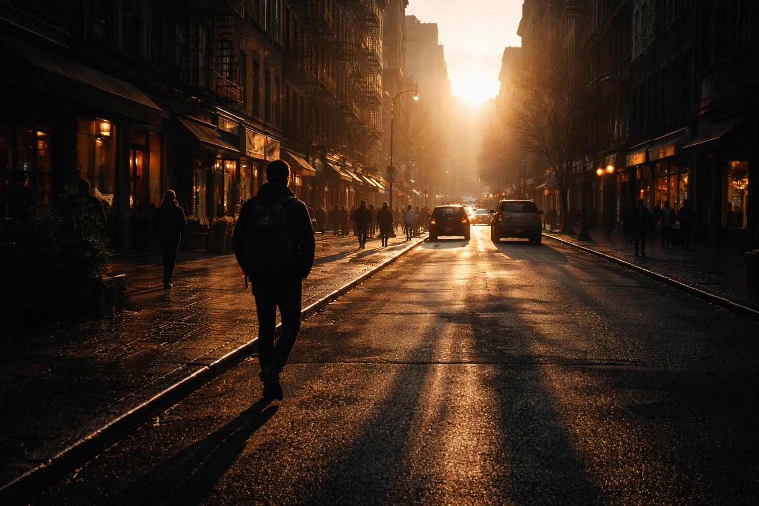 AI cinematic photography of a city street, dramatic lighting, long shadows, film-style color grading, realistic photography