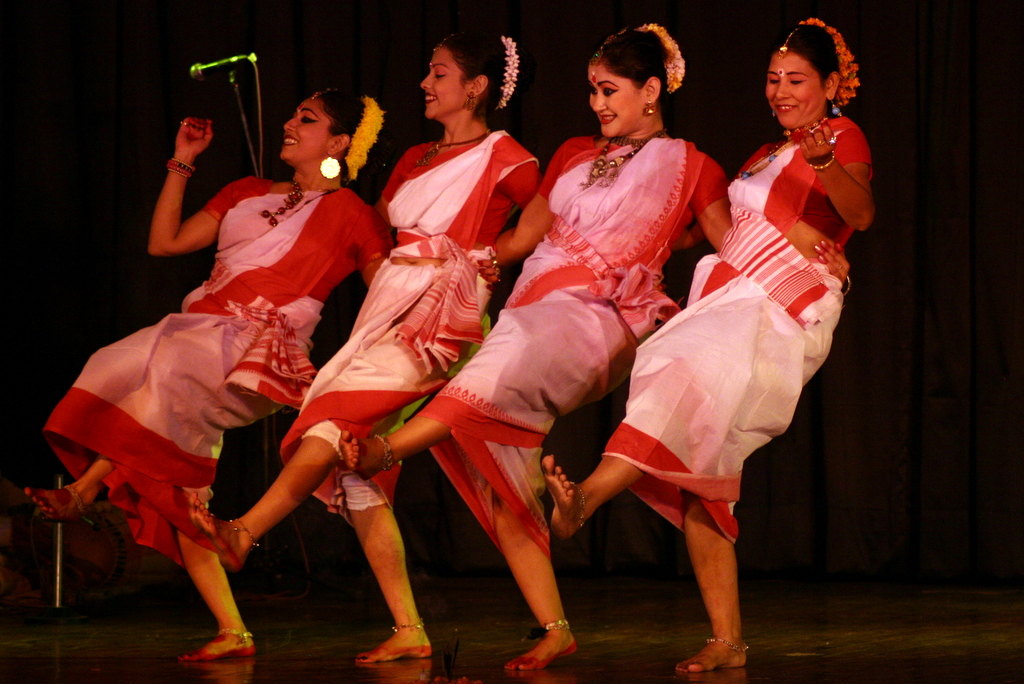 Bihu is the dance of Assam, celebrating the Assamese New Year and the arrival of the harvest season. The dancers wear elegant muga silk attire, known for its golden color. The dance involves rhythmic footwork and hand movements to the beats of traditional drums, symbolizing the joy and prosperity of the harvest.